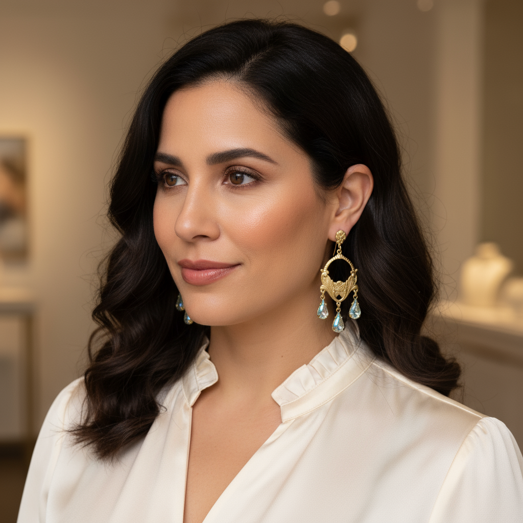 These exquisite earrings feature stunning Art Nouveau-inspired designs, adorned with aquamarine stones and crafted from brass. Prepare to be captivated by their elegant and intricate floral details, making them a must-have addition to your jewelry collection.